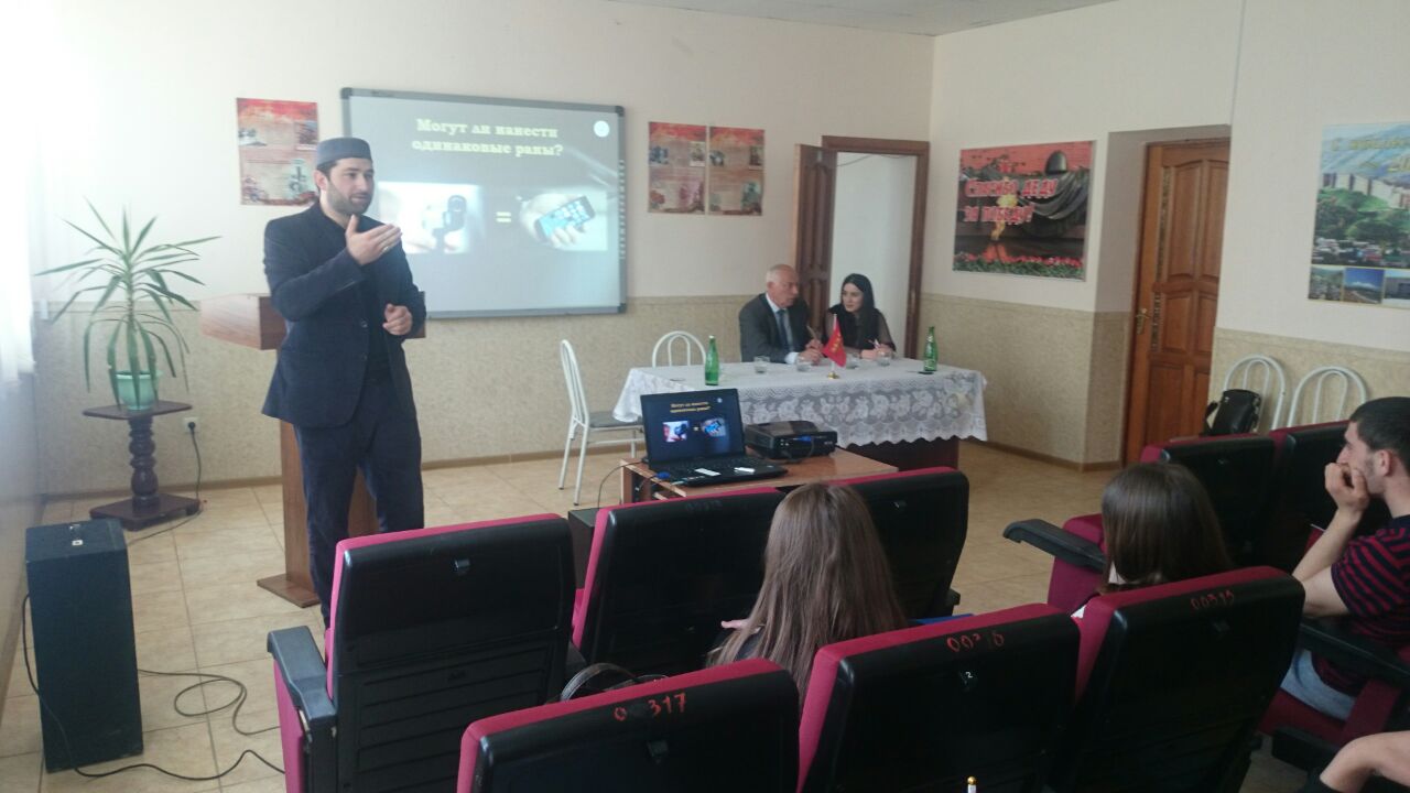 в Актовом зале Социально-педагогического института состоялась очередная встреча представителей Духовного управления мусульман со студентами Социально-педагогического института. Курбан хаджи Рамазанов в рамках реализации проекта «Интернет и морально-духовные ценности молодёжи» провёл беседу со студентами, в которой затронул тему интернета, о его пользе и вреде. Каждый несёт ответственность за содержание сайтов, а также за последствия, связанные с этим. Он в ответе за каждый бит информации, которую хранит и распространяет. Есть такая поговорка: "Каким человек видит кусок хлеба зависит от того, насколько он голоден". По аналогии с этим можно сказать: "Как и во имя чего используется Интернет человеком, зависит от его сознательности, веры» – отметил Рамазанов. Курбан хаджи Рамазанов также подчеркнул, что праведный человек праведен во всем, в том числе и в виртуальном мире.