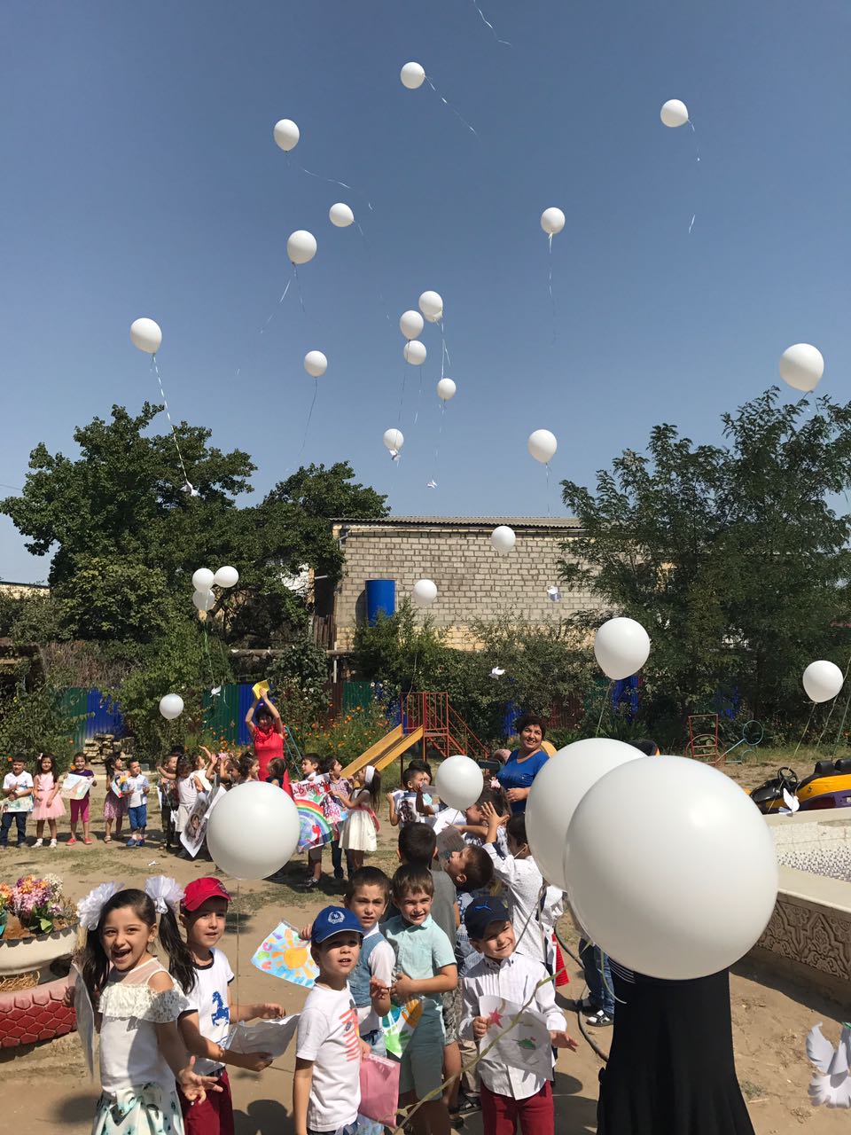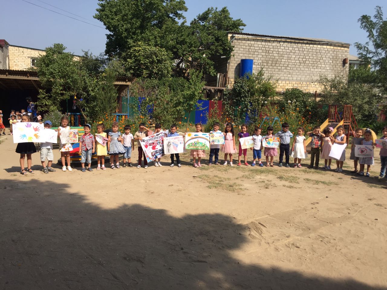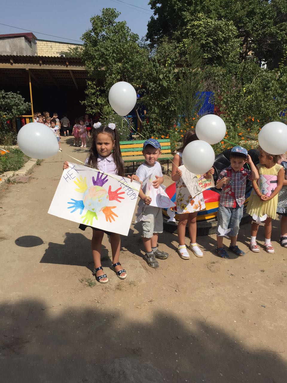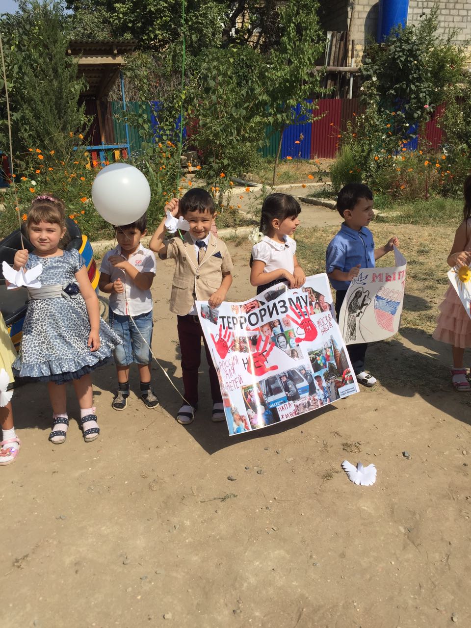 В ходе мероприятия воспитанники старшей группы «Аленький цветочек» зачитали стихи, крикнув всему миру ,что они против терроризма и выпустив в небо шары.