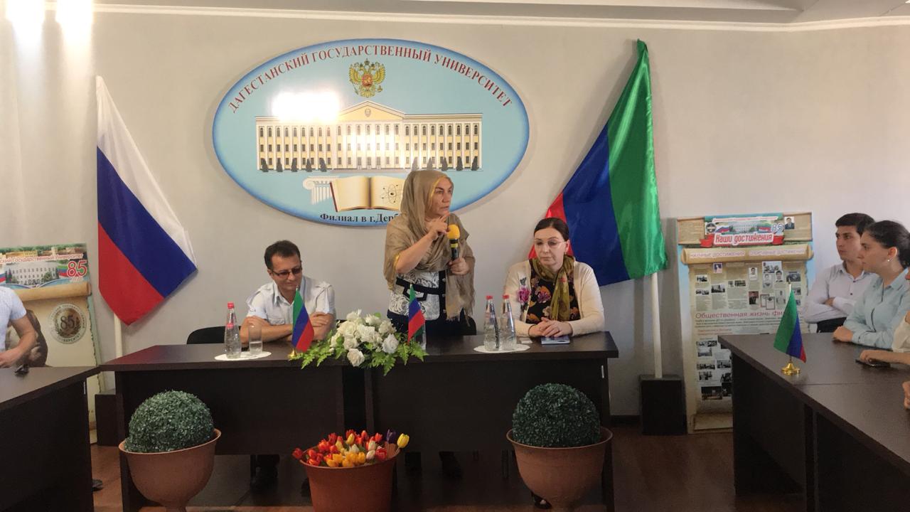 В филиале ДГУ города Дербент сегодня, 14 сентября, прошла литературно-музыкальная композиция "Страна гор-гора языков", посвященная Дню единства народов Дагестана. Студенты 2-го курса филиала ДГУ и колледжа при ДГУ представили первокурсникам песни и танцы народов Дагестана, в которых подчёркивались присущие дагестанским народам черты высокой нравственности, порядочности, храбрости и патриотизма. Перед студентами выступили также гости праздника: главный специалист управления культуры Гюльпери Мирзабалаева и главный режиссер Табасаранского государственного муздрамтеатра Джамбулат Габибов. Они акцентировали внимание на сражении народов Дагестана против захватчиков Надыр Шаха в Андалалском сражении (Гунибский район). Мероприятие завершилось исполнением танцев "Лезгинка" студентами ДГУ и учащимися колледжа.