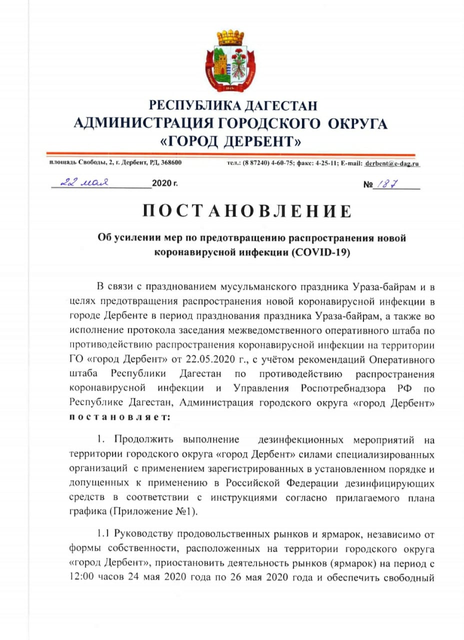 Глава Дербента Хизри Абакаров подписал постановление об усилении мер по предотвращению распространения новой коронавирусной инфекции (COVID-19)